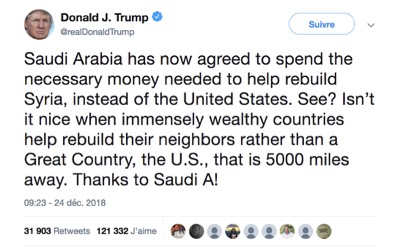 Selon le président Donald Trump, l'Arabie saoudite pourrait financer l'essentiel de la reconstruction de la République arabe syrienne.