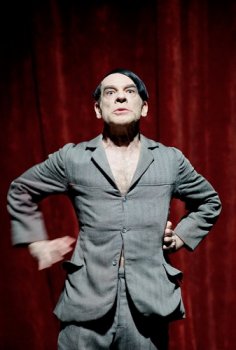 Mais c'est une autre association d'idées qui s'impose à moi : le leader qui prend des cours de théâtre me rappelle la scène de La résistible ascension d'Arturo Ui, de Brecht, où Ui (= Hitler), à la veille de sa fulgurante ascension, fait venir dans son hôtel un vieil acteur. Dans la version du Berliner Ensemble, de 1995, avec la mise en scène géniale de Heiner Müller, elle est inoubliable : elle réunit deux monstres de la scène allemande : l'un, Bernhard Minetti, incarne 60 ans ans d'histoire théâtrale, l'autre, Martin Wuttke, est un acteur prodigieux qu'on voit, au cours de la scène, se transformer en Hitler grâce à quelques trucs rudimentaires indiqués par un cabotin ringard : ce sont les trucs les plus classiques et les plus simples qui marchent le mieux ! L'acteur apprend à Ui à marcher, à rester debout, à se tenir assis, et lui donne finalement des cours d'élocution.