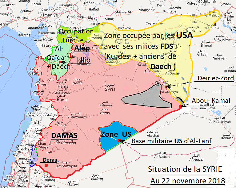 - Au sud la base stratégique US d’Al-Tanf (en bleu)