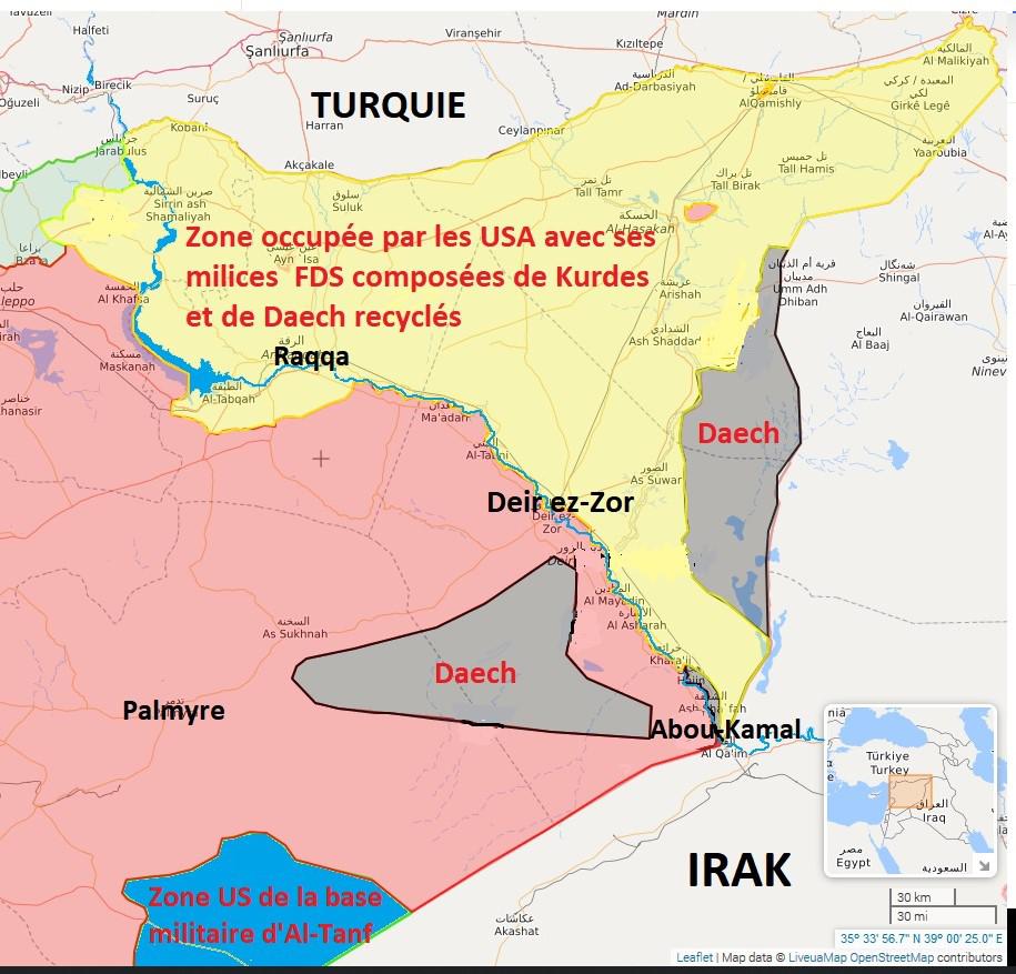 4 – ENTRE L’EUPHRATE ET LA FRONTIÈRE IRAKIENNE : les USA veulent créer un État à l’Est ?! (zone jaune de la carte ci-dessous)