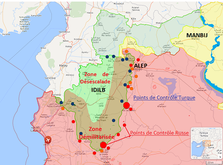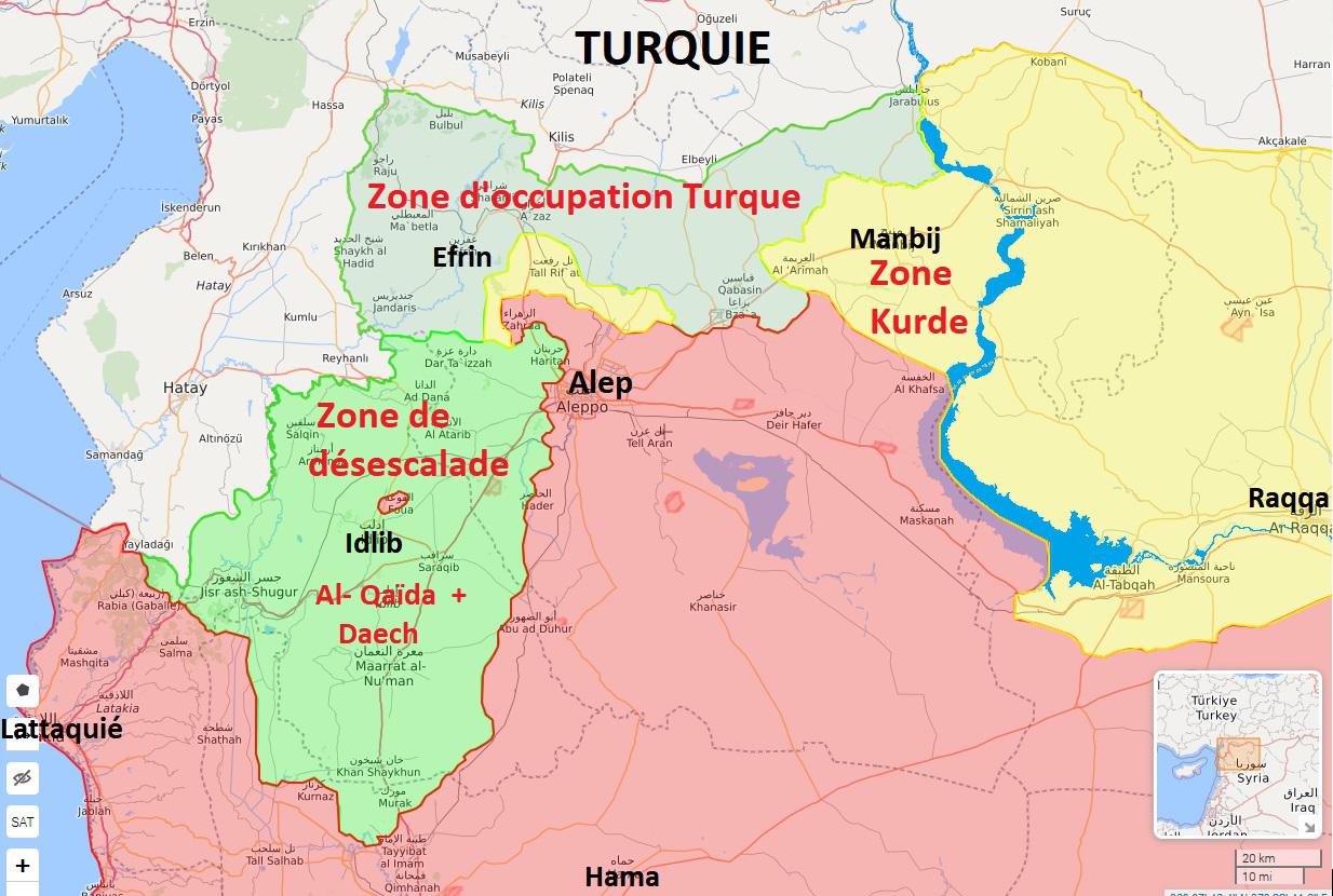 Un nouvel accord,dit de Sotchi du 17 septembre 2018 entre la Russie et la Turquie, crée une zone démilitarisée (zone en jaune sur la carte ci-dessous) de 20 km a l’intérieur de cette zone verte et engage par écrit la Turquie à désarmer tous les terroristes dans la zone démilitarisée.