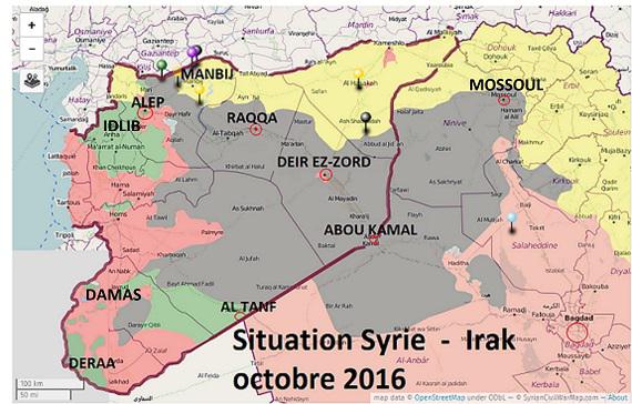 En octobre 2016, Daesh était à son apogée aussi bien en Syrie qu’en Irak . L’Etat Islamique avait pour capitales Mossoul en Irak et Raqqa en Syrie.