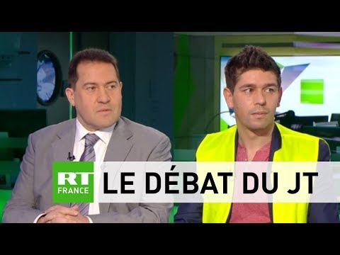 Sur le plateau de RT France, Eric Roman, secrétaire national du syndicat France Police, Policiers en colère, et Boudjema, militant Gilet jaune dans le Val d'Oise en débattent.