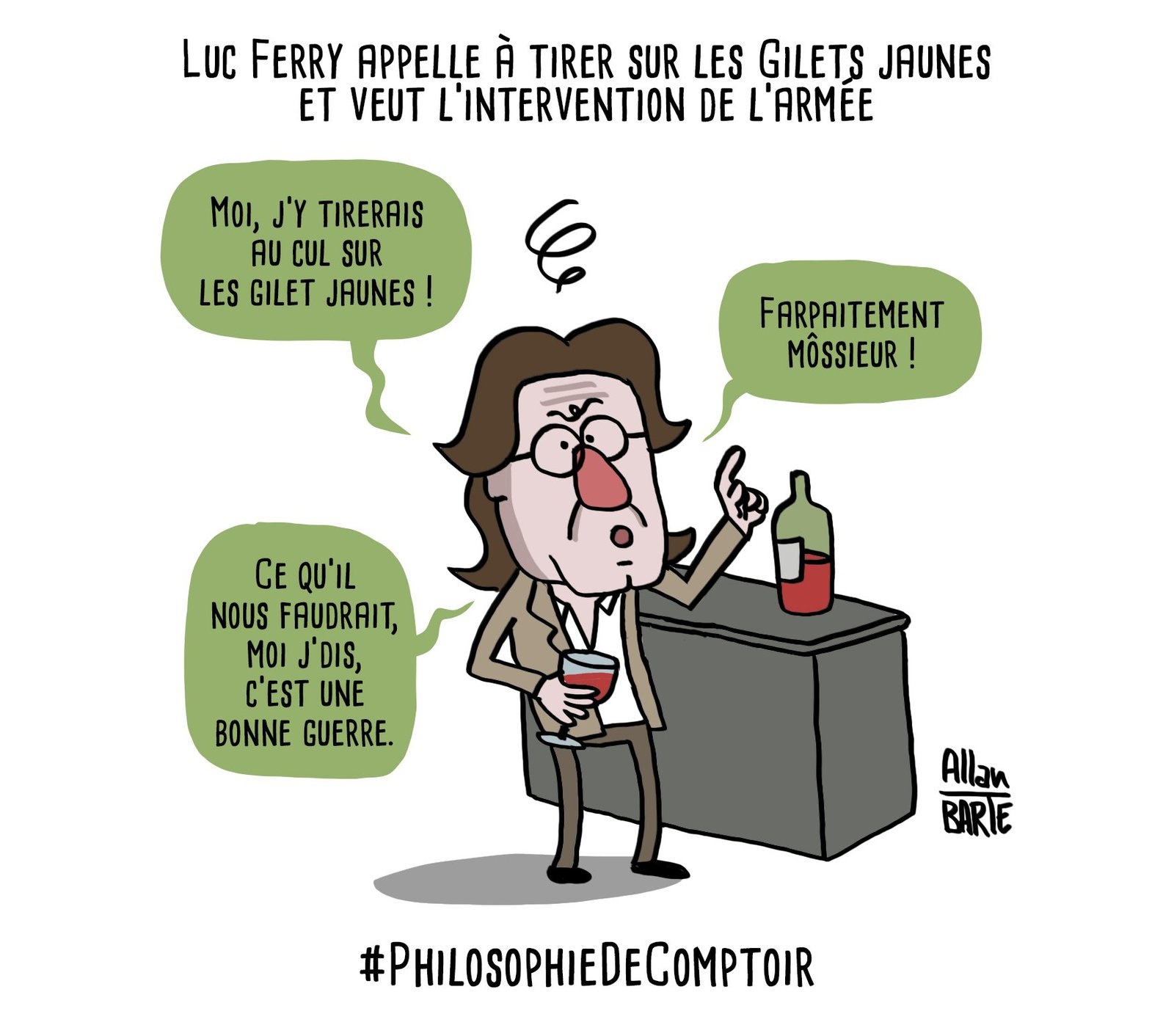 Et puis, coup de tonnerre, cette information dont je me demande si, juste après la lecture du titre, elle n'est pas un fake news ou une pochade de l'excellent "Gorafi": "Luc Ferry appelle à tirer sur les gilets jaunes et veut l'intervention de l'armée"! Très drôle... Je vérifie: pas drôle du tout, c'est une véritable information, elle se trouve sous ce titre dans "France-Soir" du mardi 8 janvier.