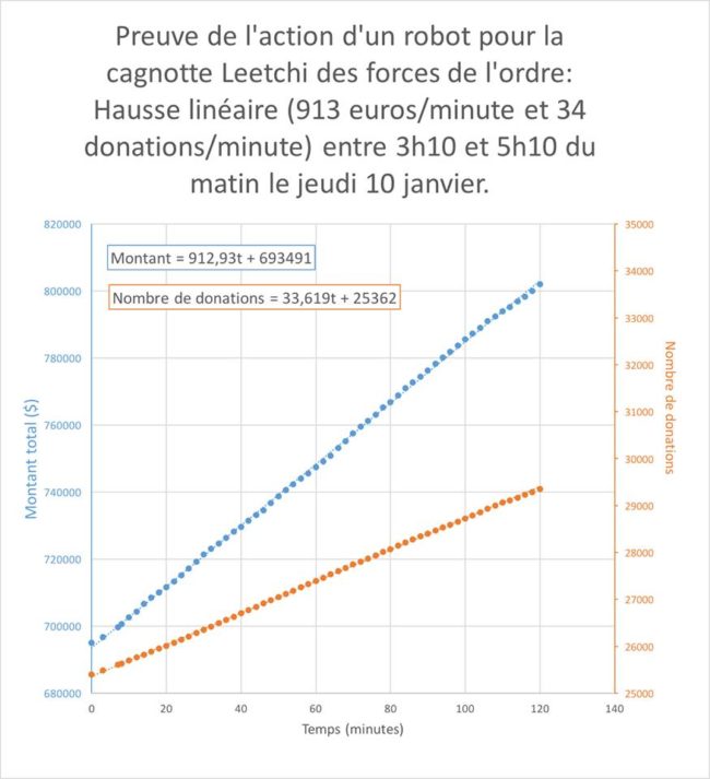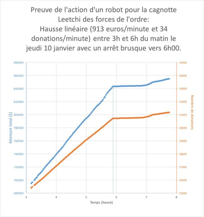 Dans la nuit du 9 au 10 janvier, un afflux considérable de donateurs, sans doute insomniaques, afflua sur le compte. Réveillé par un message privé Facebook (ding !), je notais en rafraîchissant périodiquement l'écran du site Leetchi :