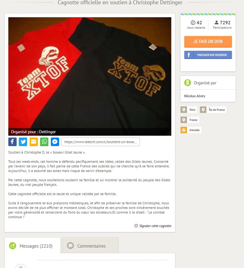 En quelques heures, la barre des 100 000 euros collectés a été franchie allègrement. Les dons affluent par milliers, ainsi que les commentaires. Je vous invite à aller les lire. Peu importe ce que vous pensez, ce que vous croyez moral ou pas. Si nous analysons froidement les choses et ce que nous révèle la réalité, c'est que, au moment où j'écris ces lignes, 8 000 personnes viennent de donner de l'argent à Christophe Dettinger, 2 500 ont écrit un mot de soutien sans cacher leur identité. En fait, vous ne pourrez plus les lire, car Leetchi a fermé la cagnotte.