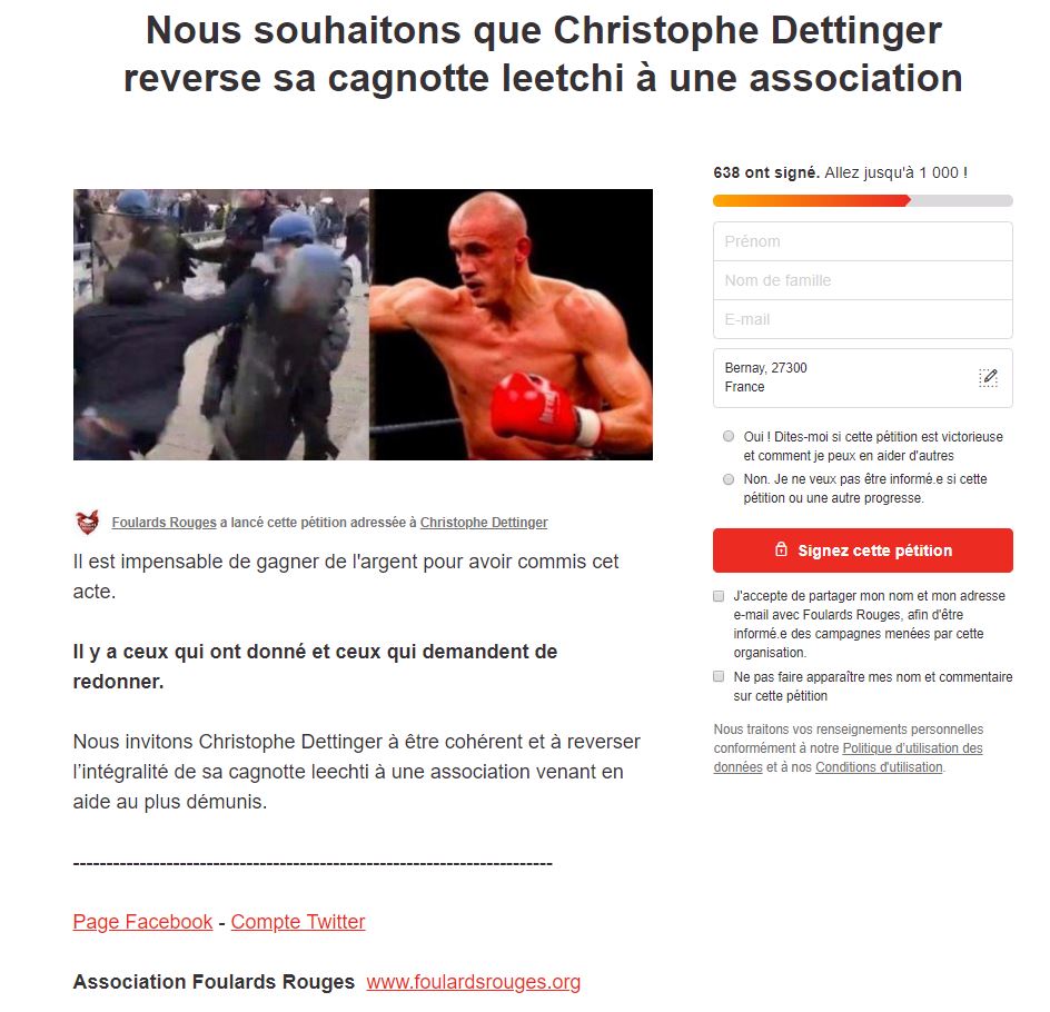 De l'autre côté, les « foulards rouges » ont lancé au même moment ou presque une pétition demandant à ce même Christophe de « rendre l'argent ».