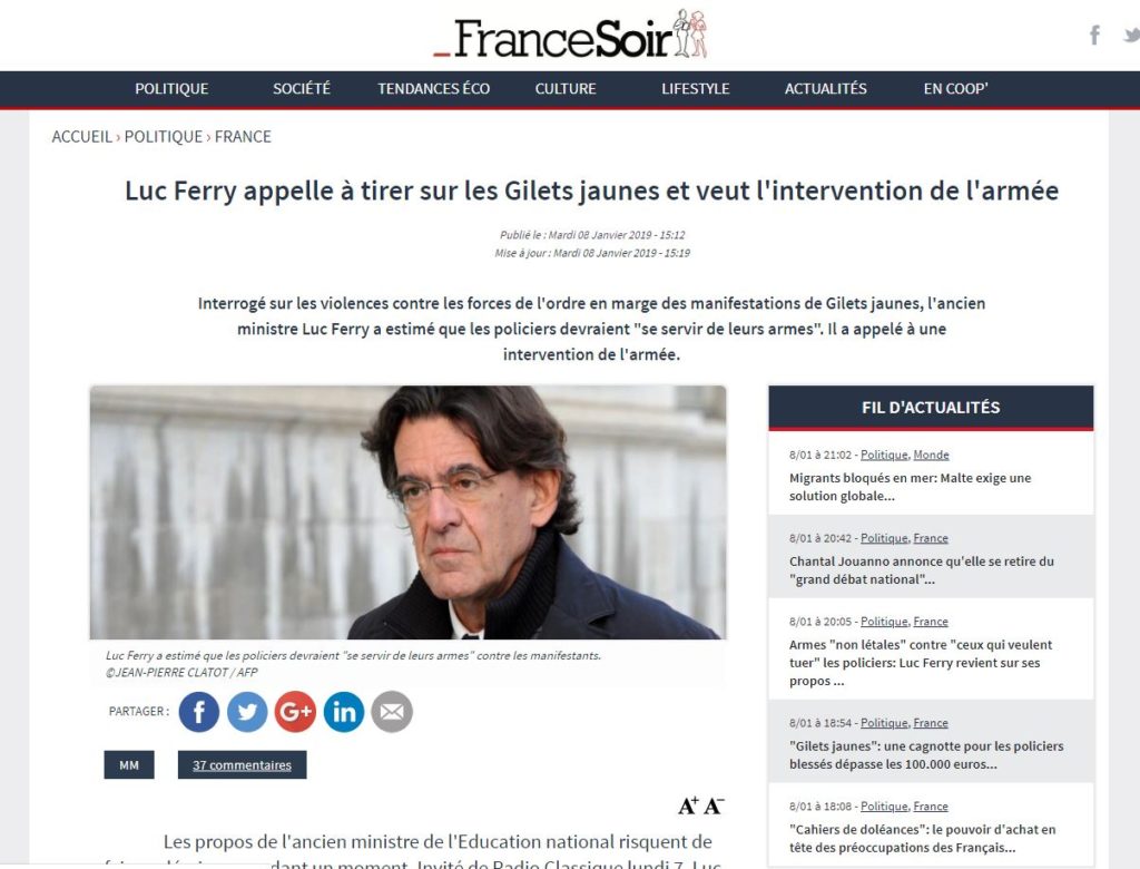 On peut aussi comme le demande Luc Ferry faire directement tirer sur la foule de Gilets Jaunes à balles réelles et tuer femmes et hommes. Comme le montre cet article de France Soir (cliquez dessus pour le croire…)