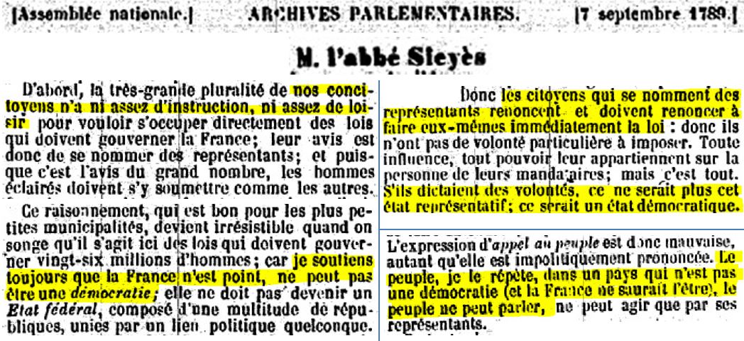 « La France ne doit pas être une démocratie, mais un régime représentatif. Le choix entre ces deux méthodes de faire la Loi, n'est pas douteux parmi nous. D'abord, la très grande pluralité de nos concitoyens n'a ni assez d'instruction, ni assez de loisir, pour vouloir s'occuper directement des lois qui doivent gouverner la France ; ils doivent donc se borner à se nommer des représentants. [...] Les citoyens qui se nomment des représentants renoncent et doivent renoncer à faire eux-mêmes la loi ; ils n'ont pas de volonté particulière à imposer. S'ils dictaient des volontés, la France ne serait plus cet État représentatif ; ce serait un État démocratique. Le peuple, je le répète, dans un pays qui n'est pas une démocratie (et la France ne saurait l'être), le peuple ne peut parler, ne peut agir que par ses représentants. » [Emmanuel-Joseph Sieyès, Discours du 7 septembre 1789 à l'Assemblée Nationale]