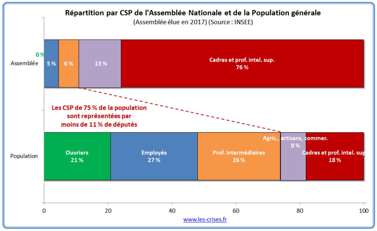 On observe donc que les populations ouvrières et employées se retrouvent à voter - pour différentes raisons - pour des représentants issus de classes supérieures. Ainsi le système électoral uniquement représentatif est devenu une sorte de suffrage censitaire (système où ne peuvent voter que les plus riches). D'ailleurs, si le système était vraiment censitaire, l'Assemblée serait-elle composée si différemment qu'aujourd'hui ?