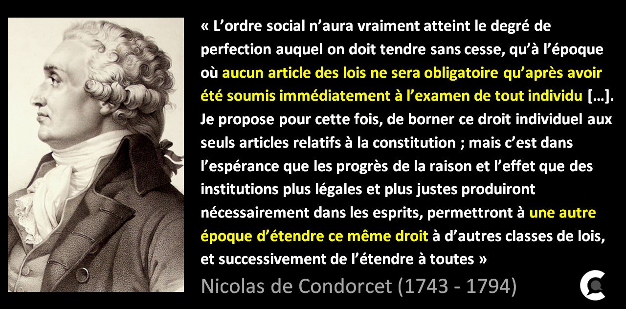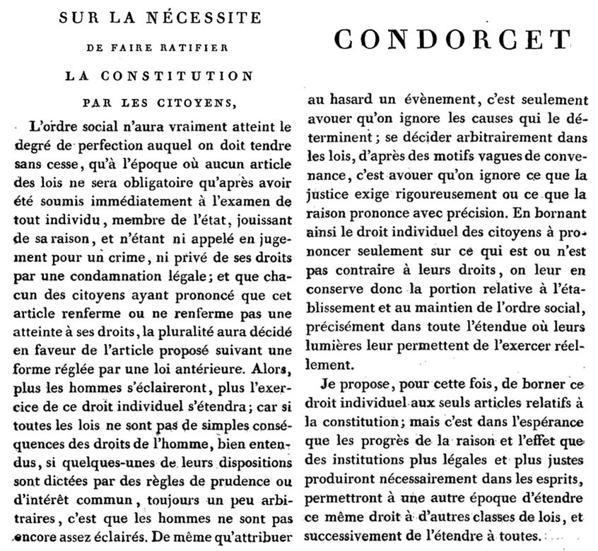 « L'ordre social n'aura vraiment atteint le degré de perfection auquel on doit tendre sans cesse, qu'à l'époque où aucun article des lois ne sera obligatoire qu'après avoir été soumis immédiatement à l'examen de tout individu [...]. Je propose pour cette fois, de borner ce droit individuel aux seuls articles relatifs à la constitution ; mais c'est dans l'espérance que les progrès de la raison et l'effet que des institutions plus légales et plus justes produiront nécessairement dans les esprits, permettront à une autre époque d'étendre ce même droit à d'autres classes de lois, et successivement de l'étendre à toutes » [Nicolas de Condorcet, Œuvres, t. 9, p.429-430, 1789]