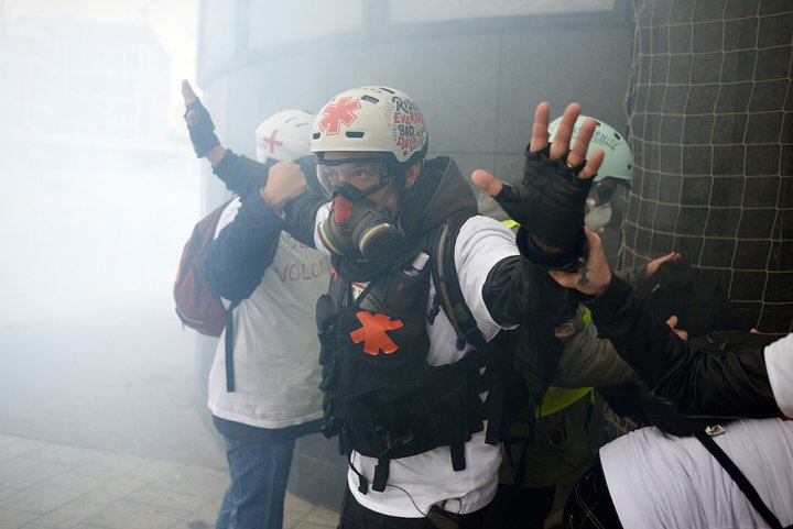 « Nous portons secours à tout le monde : manifestants, passants, policiers. Je pense que notre attitude permet une tolérance des forces de l'ordre à notre égard. Nous avons été les seuls à rencontrer le directeur de cabinet du préfet et à passer un accord oral de principe pour que nos équipes puissent travailler à peu près sereinement. Il arrive que les forces de police essaient de nous empêcher de passer, tentent de nous intimider en nous bloquant, qu'ils nous arrosent sciemment avec leur canon à eau... Mais, d'autres fois, ils nous remercient d'être là, nous facilitent l'accès à un blessé. Des petites choses. Il faut maintenir ce sésame », explique Julien, colosse à la trentaine souriante.