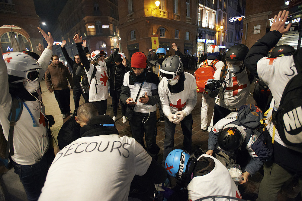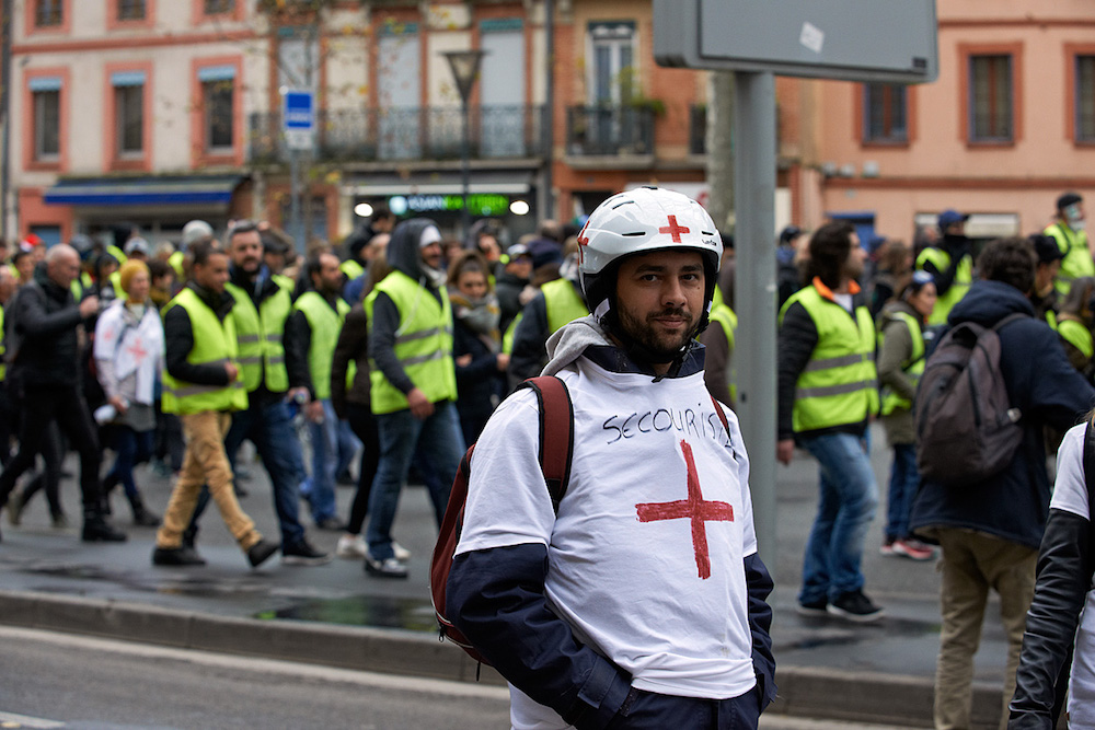 En France, on a d'abord entendu leur nom lors de l'expulsion de la Zad de Notre-Dame-des-Landes, les streets medics. Depuis, ces secouristes volontaires œuvrent partout où la répression des contestations est agressive. À Toulouse, la Ligue des droits de l'homme (LDH) recense 250 à 300 blessés depuis début décembre. L'absence d'écho donné à leur nombre et à la gravité des blessures n'empêche pas la prise de conscience et les initiatives. Ainsi, la Ville rose a vu naître aux côtés d'une poignée de medics solitaires un groupe étonnant par sa genèse et sa sociologie : les « secouristes volontaires toulousains ». Un groupe d'une soixantaine de bénévoles qui reflète les valeurs démocratiques portées par les Gilets jaunes, dont beaucoup sont issus.