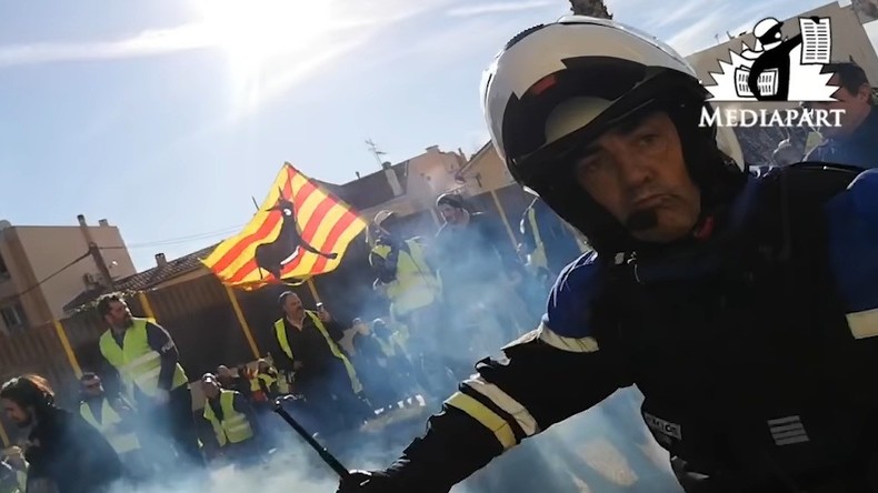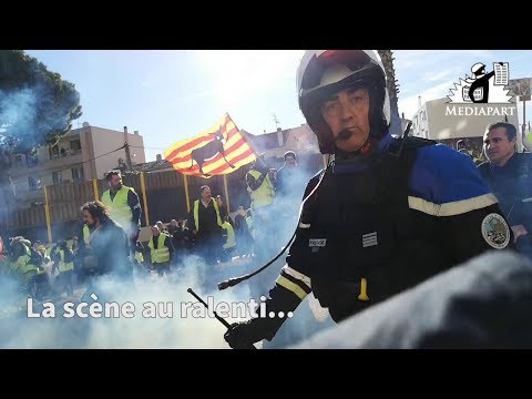 Alors que les Gilets jaunes reculent face à l'attitude menaçante de Didier Andrieux, un de ses collègues lance des grenades lacrymogènes. Le commandant déploie sa matraque télescopique pour frapper un manifestant qui filme l'affrontement, et qui ne semble pas représenter de menace.