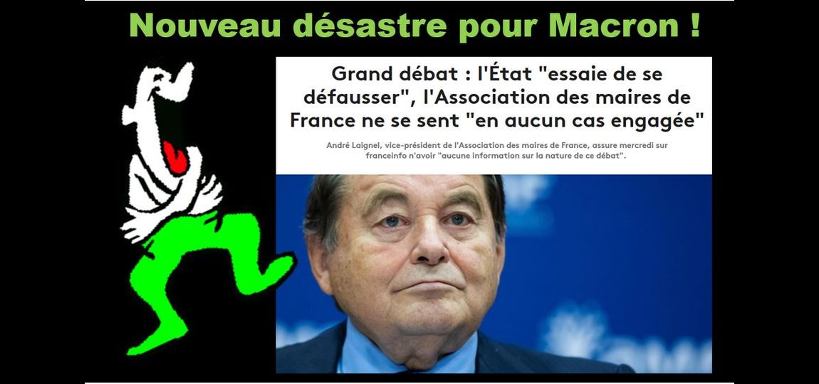 André Laignel, vice-président de la puissante « Association des maires de France » (AMF) et maire PS d’Issoudun, n’a pas mâché ses mots sur France Info pour envoyer une nouvelle gifle monumentale à Macron. Interrogé sur la volonté du gouvernement de demander aux maires de France de coorganiser le fameux « Grand débat national » censé résoudre le soulèvement populaire des « Gilets Jaunes », André Laignel a répondu textuellement : « les maires de France ne se sentent en aucun cas engagés par ce débat et ne sauraient être, à quelque niveau que ce soit, coorganisateurs ».