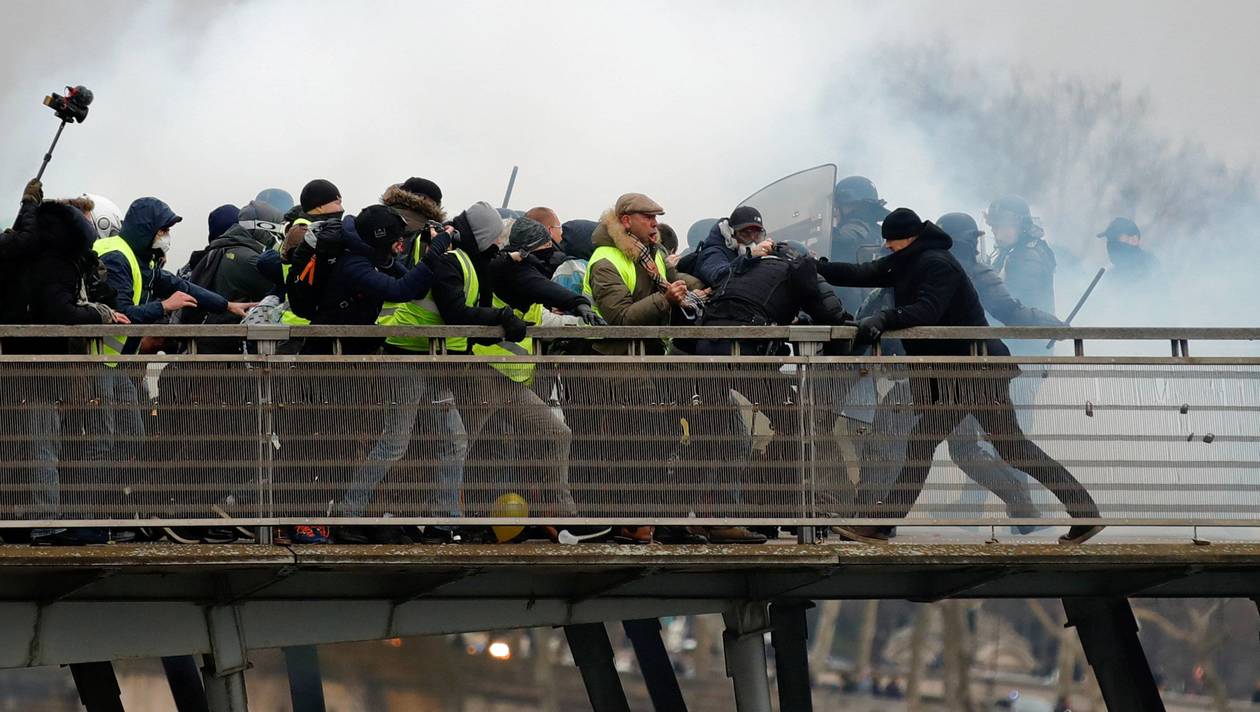 Les canons à eau sont réhabilités et ne discutent même pas. En hiver, parfois contre une petite poignée de manifestants. Les tirs de flash ball à hauteur de visage – normal. Frapper les gens à terre, les coincer contre les murs et frapper – normal. Lancer des grenades de désencerclement non pas en les faisant rouler à terre, mais en les lançant en l’air pour qu’elles retombent dans la foule – normal. Le gazage systématique – normal. Les aérosols que les policiers pulvérisent sur les visages des manifestants, comme on arrose les insectes dont on veut se débarrasser – normal.