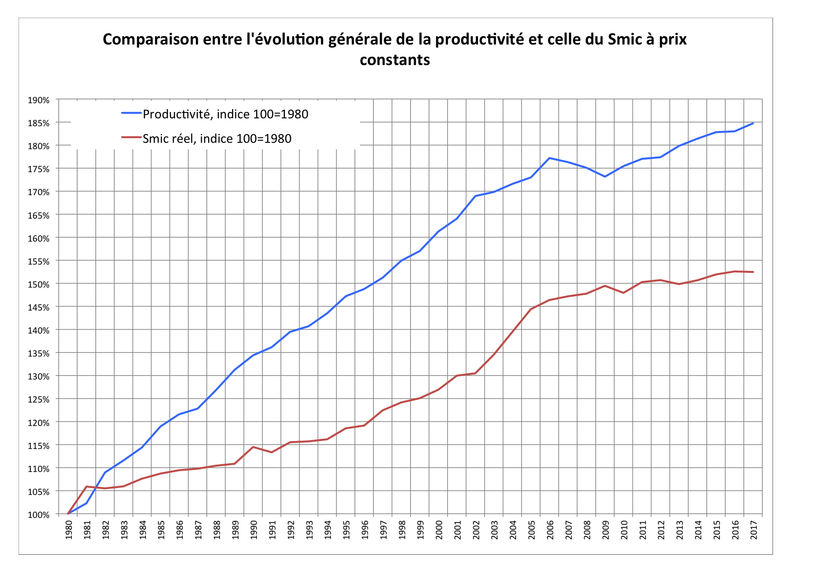 Depuis le « tournant » de 1982-1983 le SMIC, qui est l'un des principaux instruments de garantie pour les bas salaires, n'a pas évolué avec la productivité. Il convient ici de rappeler un principe : si le salaire évolue au même rythme que la productivité le partage de la valeur ajoutée entre les salaires et les profits ne change pas. Quand la productivité croit plus vite que le salaire, alors la part des profits augmente au détriment des salaires. L'écart entre l'évolution du SMIC et celle des gains de productivité est aujourd'hui important. Un rattrapage de l'ordre de 20% s'impose. Cela impliquerait une hausse d'environ 240 euros par mois pour le SMIC, soit bien au dessus et au-delà du mécanisme imaginé par le gouvernement pour apporter 100 euros de revenus à une partie des « smicards ».