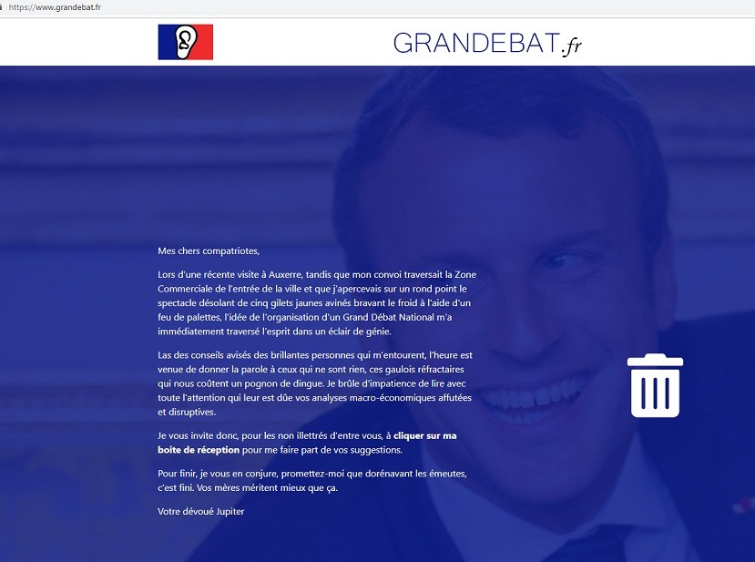 Le site grandebat.fr a concocté une fausse lettre ironique d'Emmanuel Macron évoquant la genèse de l'idée du grand débat national. Le président fictif ne manque pas d'y épingler des «Gilets jaunes avinés». «L'heure est venue de donner la parole à ceux qui ne sont rien, aux Gaulois réfractaires qui nous coûtent un pognon de dingue», persifle-t-elle en reprenant plusieurs expressions du président qui avaient fait polémique. © Capture d'écran @grandebat.fr