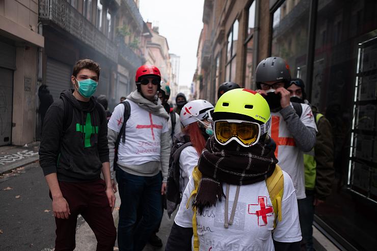 A Toulouse, samedi, où la préfecture a recensé jusqu'à 10 000 personnes, soit la mobilisation la plus fournie de l'hexagone, ils et elles ne sont pas loin d'une centaine à arpenter les rangs de la manifestation. Seule une petite dizaine, cependant, revendique l'appellation street medics. Leurs « croix bleues », c'est leur nom, les distinguent des « secouristes volontaires », qui arborent une signalétique rouge et sont bien plus nombreux ce jour là, presque 80.
