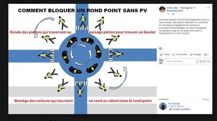 Dans ces journées françaises, l'insurrection/révolte ne s'articule dans aucun espace dichotomique sacré-unique, le "nous/eux" sanctionné par exemple par la forme classique du défilé (Judith Revel explore ce thème dans une intervention qui sera bientôt publiée). Nous voyons plutôt une prolifération d'espaces et d'actions, des occupations de rond-points, la présence constante de l'organisation, mais dans l'absence de leader (leaderlessness). Prenons, par exemple, les occupations des carrefours giratoires, souvent citées dans les récits et les reportages. Un espace, comme par hasard circulaire, créé pour la gouvernance contemporaine de la mobilité et repensé comme lieu d'action politique et de production : "filtrage" (comme le dira un manifestant : "on ne bloque pas, on filtre"), espace de communication et d'échange avant même que de blocage des flux. Dans de nombreux cas, les automobilistes expriment leur adhésion à la protestation en klaxonnant et en saluant depuis les voitures : dans ces carrefours, une alliance inhabituelle de corps et de corps- machines se construit. (Bien que dans un autre contexte et à une échelle très différente, j'ai pu constater l'efficacité politique et communicative des occupations courtes de ronds-points, lors de la journée de la grève féministe du 8 mars dernier, le long du défilé qui a eu lieu à Pérouse.)