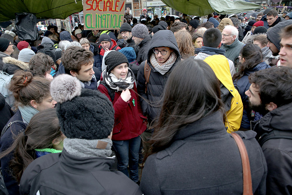 Le rassemblement fait la part belle aux échanges et à l'émergence de propositions concrètes pour repenser une société plus respectueuse de la planète, du vivant et des questions sociales. Les débats sont organisés autour des cinq thèmes suivants : « Fin du monde, fin du mois », « Changer sa ville », « Mobilisation étudiante et lycéenne », « Quel "grand débat" ? » et « Désobéissance civile pour le climat ». Une bonne partie de la place de la République est désormais noire de monde et occupée par 8.500 personnes. Dans son micro, un représentant d'Alternatiba chante : « Les petits pas, les petits pas, ne suffisent pas. » Les manifestants sautillent en rythme pour se réchauffer. Sur les pancartes s'étalent les slogans « T'es bonne sans carbone », « Y'a pas de rattrapage pour le climat » ou encore « Le climat, c'est comme le cul, faut se protéger ».