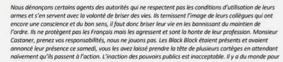 Ce qui permet au pouvoir d'opposer les « gentils » manifestants respectueux de la République qui eux ont droit de manifester et les méchants GL qualifiés de manière répétitive de « brutes » par Castaner à l'Assemblée nationale et qui donc... peuvent l'objet d'une loi anti-casseurs et donc être interdits de manif !