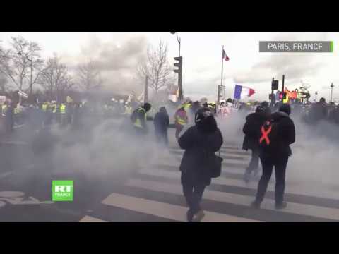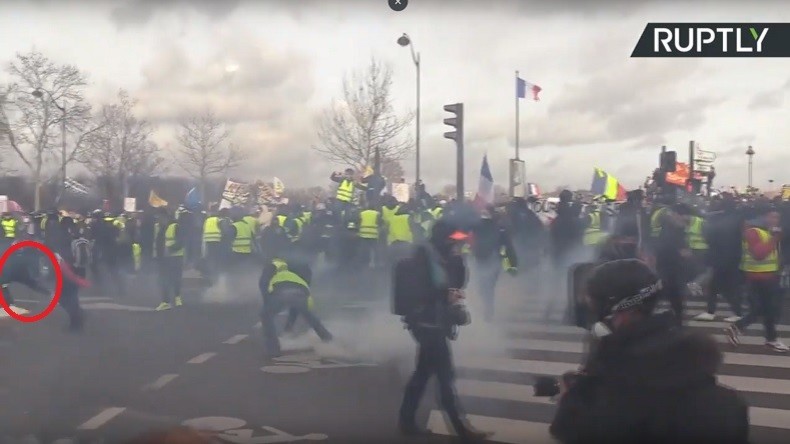 L'agence vidéo de RT a capturé le moment précis où une grenade de désencerclement a explosé à quelques centimètres de la main d'un manifestant, qu'elle a arrachée. Sur les images, il semblait se pencher pour ramasser le projectile.
