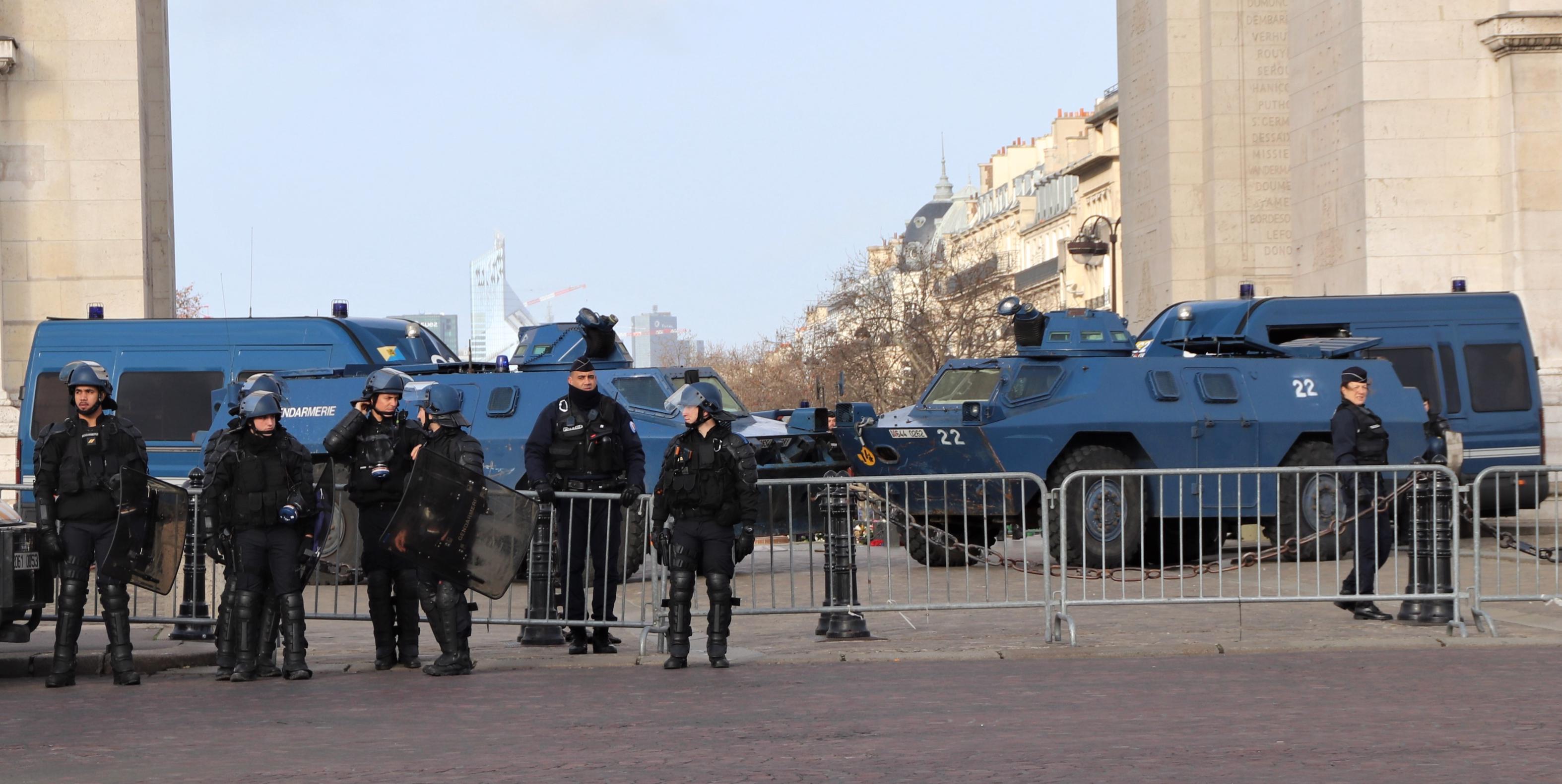 Véhicules blindés de la police à l'Arc de Triomphe sur l'avenue des Champs-Elysées à Paris