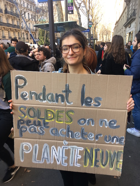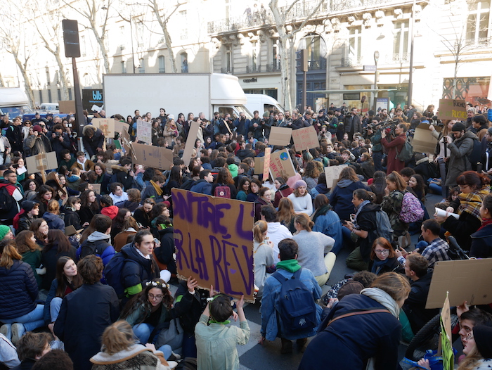 Au mégaphone, Léna, étudiante en géographie, a rappelé la demande sur laquelle les jeunes s'étaient mis d'accord pour ce premier jour de la grève française des jeunes pour le climat : « Nous demandons la diminution des émissions de gaz à effet de serre de 4 % par an ! » Assise sur le bord du trottoir avec quelques copines, Anna était venue du lycée parisien Lavoisier : « C'est notre première mobilisation pour le climat. On pense que c'est un sujet important et on a l'impression que le gouvernement ne considère pas assez cette cause ! »