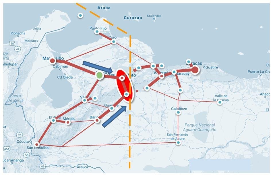 Lo que el análisis hace explícito en el mapa es que, en el caso de una eventual intervención armada, bastaría con el control del eje Acarigua-Barquisimeto, para lograr la separación efectiva de todo el occidente del país.