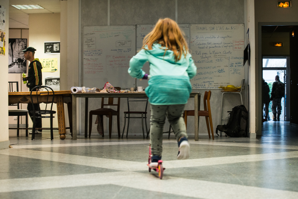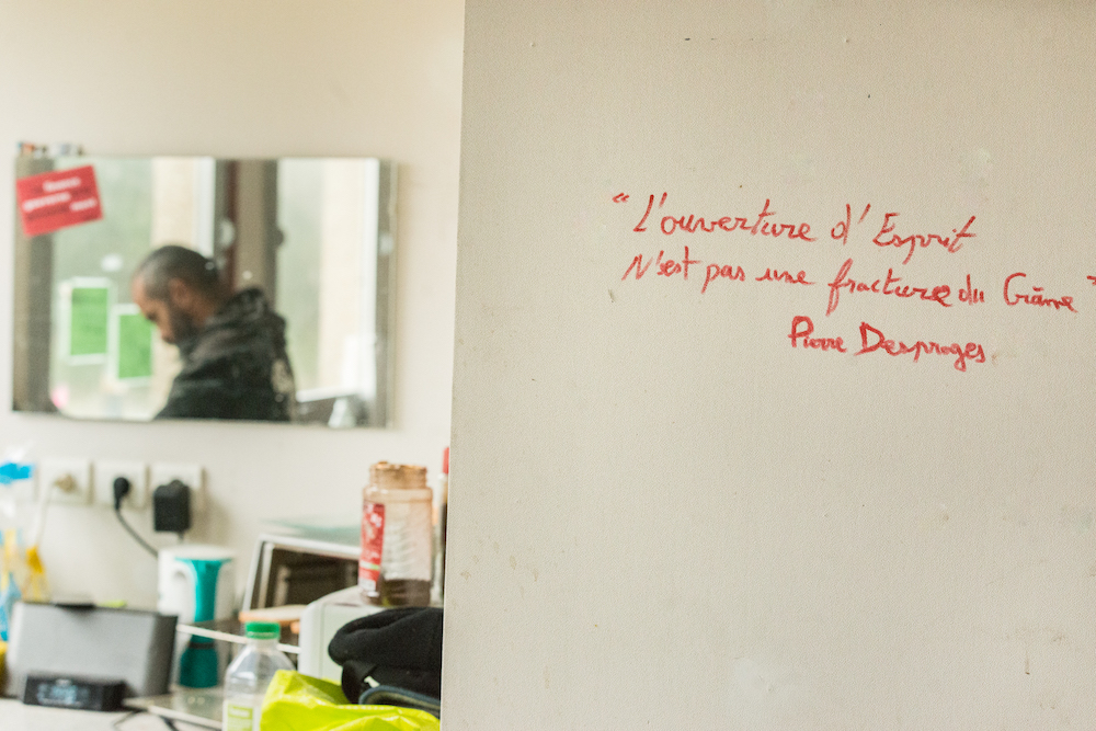 Jo n'y était pas, mais on lui a raconté l'histoire, plusieurs fois : cette Maison du peuple, celle d'aujourd'hui, est née presque par hasard. Le 24 novembre 2018, le rassemblement des Gilets jaunes a été appelé devant la sous-préfecture. Certains se sont trompé d'endroit et se sont retrouvés devant les locaux inoccupés de ce qui n'a été sous-préfecture qu'une seule année, le temps de rénover les bureaux habituels. Ce bâtiment vide, une ancienne antenne de Pôle emploi, n'est pas tombé dans l'œil d'aveugles : son occupation a été proposée en fin de manif, sans avoir été préparée par un petit comité, comme c'est l'usage pour les ouvertures de squats. Une vingtaine de personnes qui ne votent pas, ou plus, y ont vite élu domicile. Sur la porte bleue des anciens bureaux, à la craie, le mot « chambre » indique la limite des espaces privés.