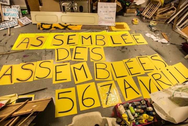 Dans cette maison commune, lino gris, murs bien blancs, il ne manque qu'un espace d'assemblée un peu plus vaste que ce faux hall desservant les anciens bureaux. Depuis près de trois mois, la Maison a pris ses habitudes : un sac de boxe accroché au sous-sol pour se défouler ou s'entraîner à cogner, des jouets pour les mômes dans un petit bureau, un atelier pour peindre pancartes et banderoles, une cuisine bien rangée. Une ancienne salariée de Pôle emploi a retrouvé les locaux où elle a travaillé, et y vient désormais comme Gilet jaune.