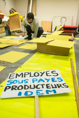 Contre le mur, des pancartes fraîchement peintes. « Au champ plutôt qu'Auchan », ou « Mangez locale (sic) et non mondiale (sic) ». « Ah là là, la big faute », s'exclame cette femme en reculant d'un pas. Un autre panneau : « Paradis pour les uns, pas de radis pour les autres. » Sans faute, celui-là.