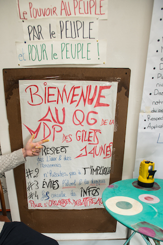 Dylan, 21 ans, est dans le mouvement depuis le tout début, mi-novembre. Il a quitté son hébergement familial pour se faire résident permanent dans ce squat plutôt confort : « J'ai tracté avant le 17. Ce jour-là, je travaillais. Je suis allé pendant mon temps de pause. Les gens dans les voitures ne gueulaient pas. On filtrait au rond-point, c'était hyper joyeux. Ici, j'apprends plein de trucs, sur l'État, sur la Constitution. Je viens des quartiers, la répression au quotidien, ça, je connais. Parmi les Gilets jaunes, tout le monde n'était pas au courant, certains l'ont pris de plein fouet. Avant, ce que je savais, c'était superficiel. En une demi-heure, je pourrais refaire la France, tout seul, mais ça serait pas collectif. Aucun intérêt. »