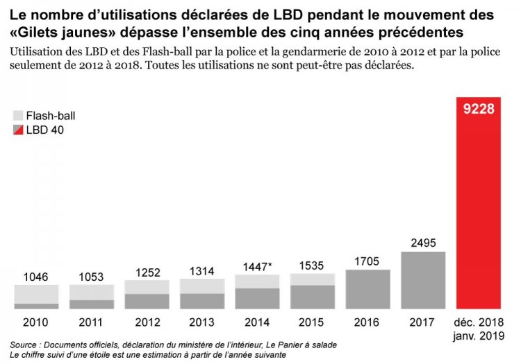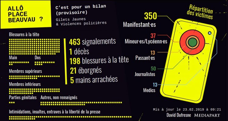 Le lendemain matin, Aphatie, pour une fois utile, tout arrive dénonce le silence des pouvoirs publics autour des violences policières [14]. La semaine suivante, Libération publie un décompte des blessés graves [15]. Aucune profession n'étant plus moutonnière, le thème s'impose ensuite partout dans le débat public. L'action David Dufresne est soudain à la hausse sur les cours médiatiques ; on achète frénétiquement, comme pour se racheter une virginité après un silence complice de près de 2 mois. Suivra un débat technique et dépolitisé sur le LBD 40 (les policiers n'ayant qu'à faire du chantage au tir à balles réelles pour conserver leurs éborgneurs), plébiscité par la base électorale du parti de l'ordre [16].