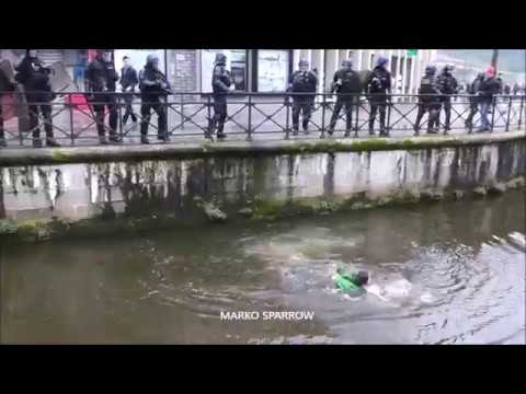 Scène insolite à Quimper, où un jeune homme a décidé de sauter dans un canal pour échapper à des gendarmes mobiles qui le poursuivaient pour une raison inconnue, en marge de la manifestation des Gilets jaunes.