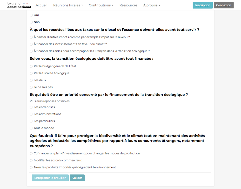 Après avoir entré mon adresse électronique, j'ai répondu au QCM en ligne sur la transition écologique. Arrivée au thème « à quoi les recettes liées aux taxes sur le diesel et l'essence doivent-elles avant tout servir ? », à laquelle je pouvais, au choix, répondre « à baisser d'autres impôts par exemple l'impôt sur le revenu », « à financer des investissements en faveur du climat » ou « à financer des aides pour accompagner les Français dans la transition écologique », je me suis sentie envahie d'une lassitude. Quelle drôle de manière de résumer la fiscalité écologique ! J'ai alors décroché mon téléphone, et appelé Jean-Michel Fourniau, sociologue et membre de l' Observatoire des débats. « La plate-forme a été essentiellement conçue comme une consultation, où chaque individu peut donner son avis, m'a-t-il expliqué. Mais, un débat ne se résume pas à une série de questions, il faut un échange, des arguments et des contre-arguments. » À le croire, le « grand débat » tiendrait plus du sondage que l'exercice démocratique.