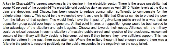 En spéculant sur la " grave possibilité qu'environ 70 % du réseau électrique du pays puisse s'éteindre dès avril 2010 ", le dirigeant du CANVAS a déclaré qu'" un groupe d'opposition serait mieux servi pour profiter de la situation et la retourner contre Chavez et à son avantage ".