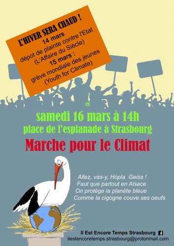 C'est dans ce contexte qu'une « Marche pour le climat » en faveur de mesures rapides visant à limiter la hausse des températures liées aux émissions de gaz à effet de serre et à protéger la biodiversité aura lieu samedi 16 mars à Strasbourg.
