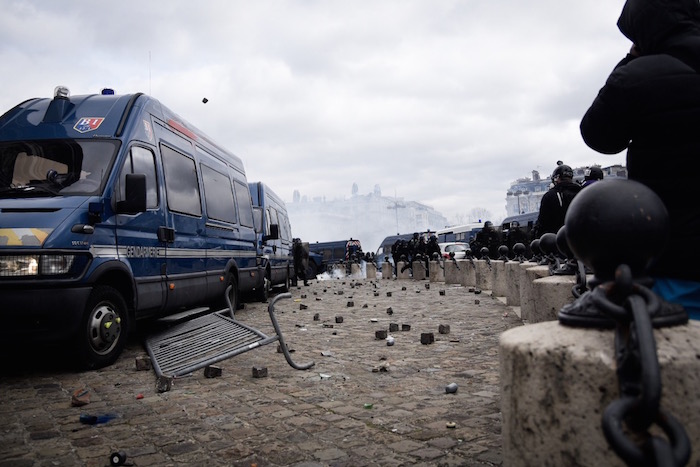 Paris, 12 h 45, Reporterre Sur les Champs-Élysées, c'est l'escalade de la tension. Les forces de l'ordre se sont repliées place de l'Étoile, derrière leurs camions, essuyant des jets de pavés et de cocktails Molotov.