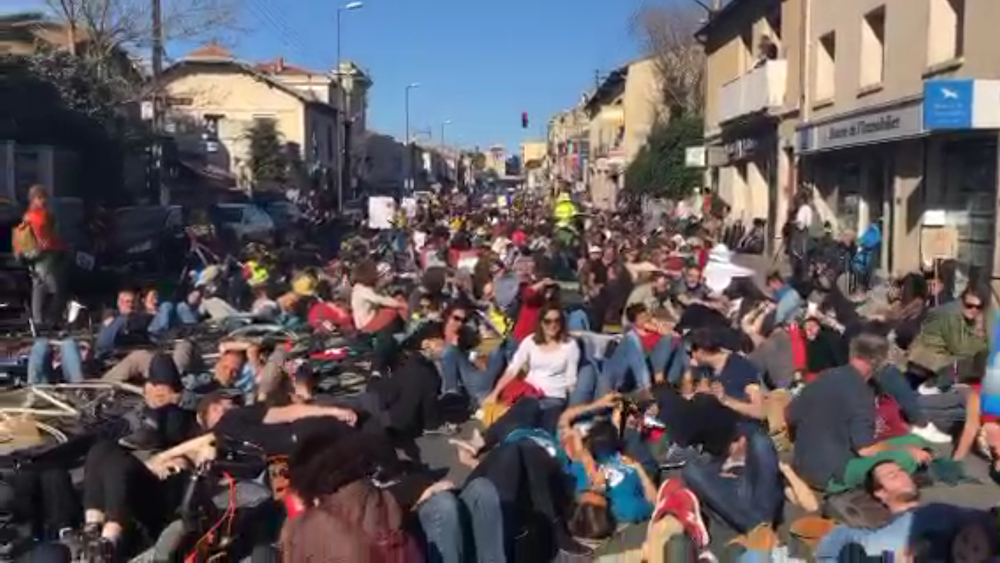 Un « die-in » de cyclistes et de piétons organisé à Montpellier dans l'après-midi du 16 mars.