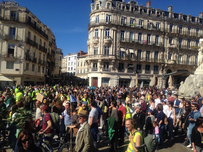 Montpellier, 15 h 40 Le cortège climat a rejoint les Gilets jaunes au cri de : « Tous ensemble tous ensemble » et « Gilets jaunes, Gilets verts, même combat ». Beaucoup de monde sous le soleil. Les vélos sont éparpillés parmi les manifestants. Certains ont fait près de 20 km pour venir.