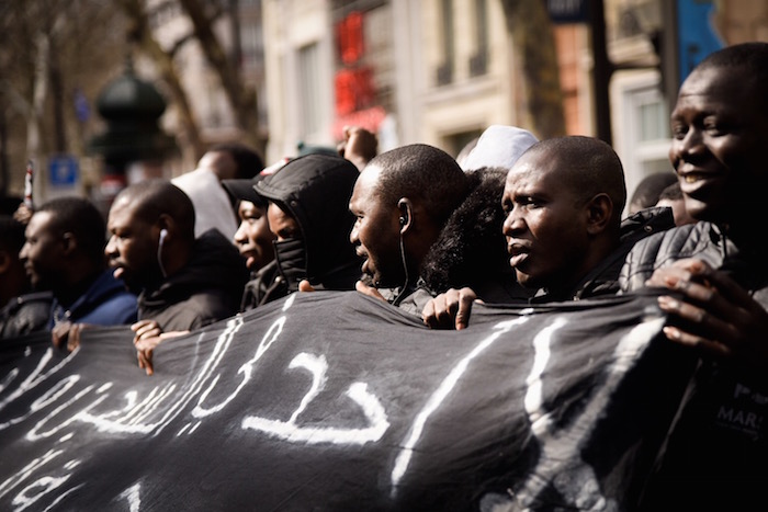 Paris, 15 h 55 La marche des solidarités arrive place de la République à l'instant. Les manifestants lèvent les poings, serrés, en l'air. Au micro, Assa Traoré, du comite Justice pour Adama, lance « Pas de justice, pas de paix ». Elle est reprise par la foule. Le cortège ne s'arrête pas sur la place et poursuit son chemin boulevard de Magenta, en direction de Stalingrad.