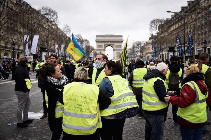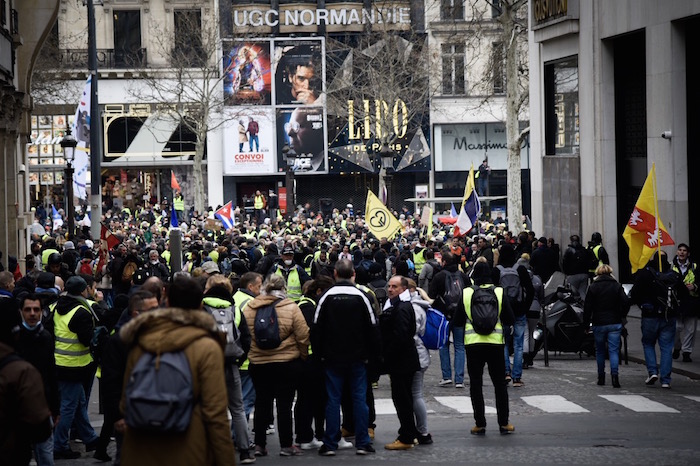 Plus d'un millier de Gilets jaunes sont présents sur l'avenue, en petits groupes. Peu de pancartes, mais des gilets customisés, avec des numéros de département, la devise « Liberté, Égalité, Fraternité », des têtes de mort.