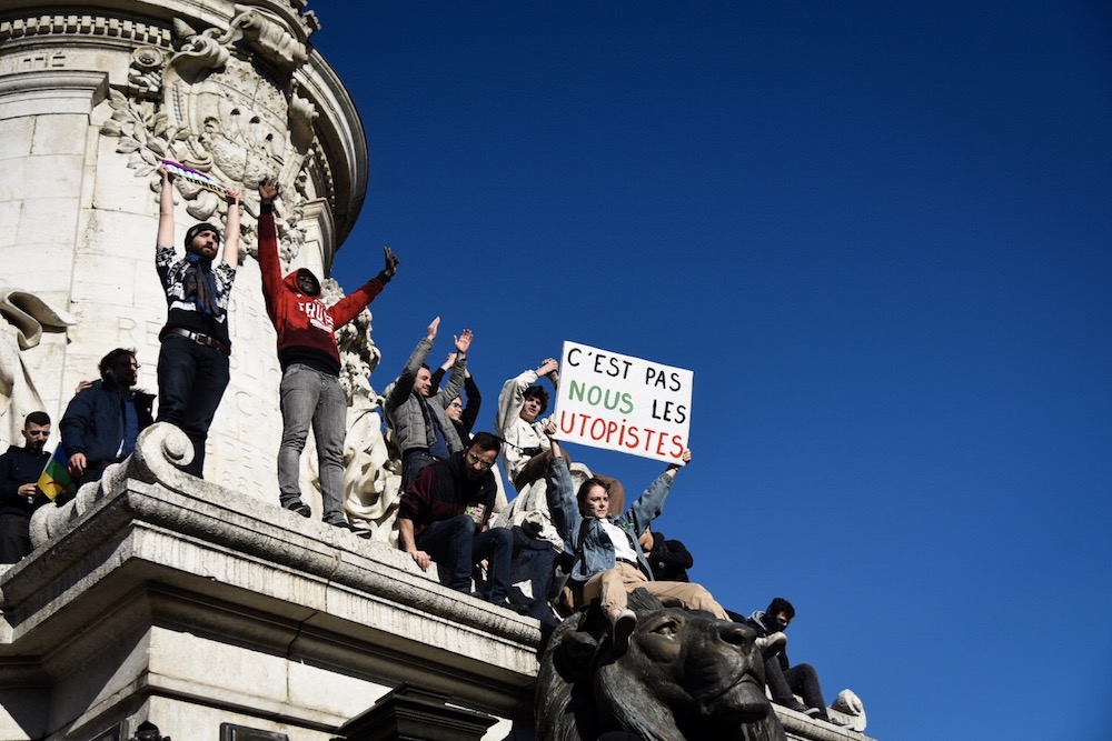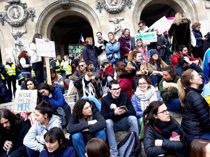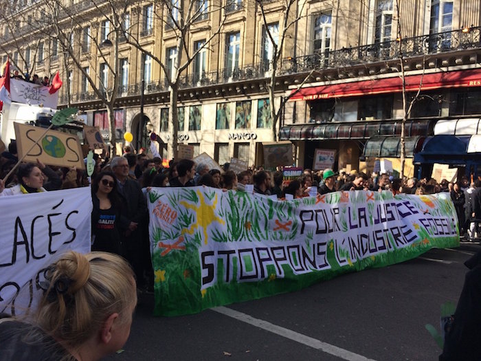 Paris, 16 h 27 Sur les Grands-Boulevards, le flot vers République ne tarit pas. C'est un concours de pancartes toutes plus créatives les unes que les autres : « Rendez-nous les oiseaux ! », « Allumez-pas le feu », « Sans pétrole, la fête est plus folle », « À force de faire l'autruche, il n'y en aura plus ».