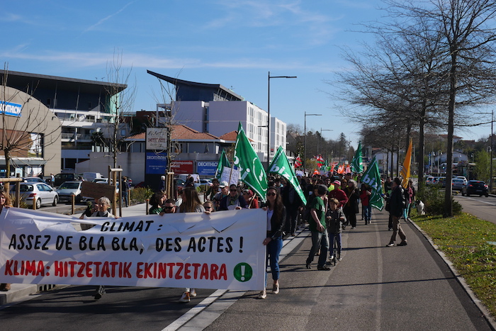 À Anglet, plus de 1.000 personnes se sont retrouvées à 10 h 30 pour le climat en chansons et à vélo pour beaucoup. Les militants de Bizi ! et les associations cyclables ont pointé du doigt que, malgré les récents travaux réalisés sur l'avenue, aucun aménagement pour les cyclistes n'avait été prévu. Or, selon eux, cela contrevient au Code de l'environnement, qui oblige à prévoir des infrastructures cyclistes dès que des travaux sont réalisés.