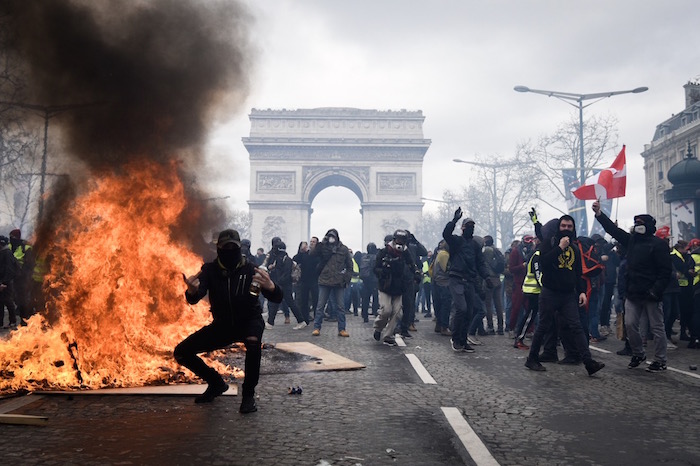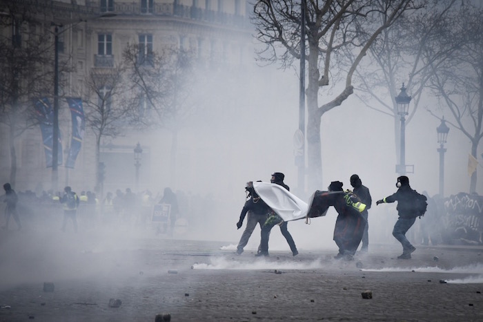 Certains cassent les protections des grandes enseignes. Des grenades explosent régulièrement. La fumée piquante des gaz lacrymogènes force des centaines de Gilets jaunes à redescendre l'avenue. Beaucoup pleurent, certains font des crises d'angoisse. « Remontez, revenez », exhorte l'un d'entre eux. Les équipes de street medics s'affairent pour les secourir et les rassurer.