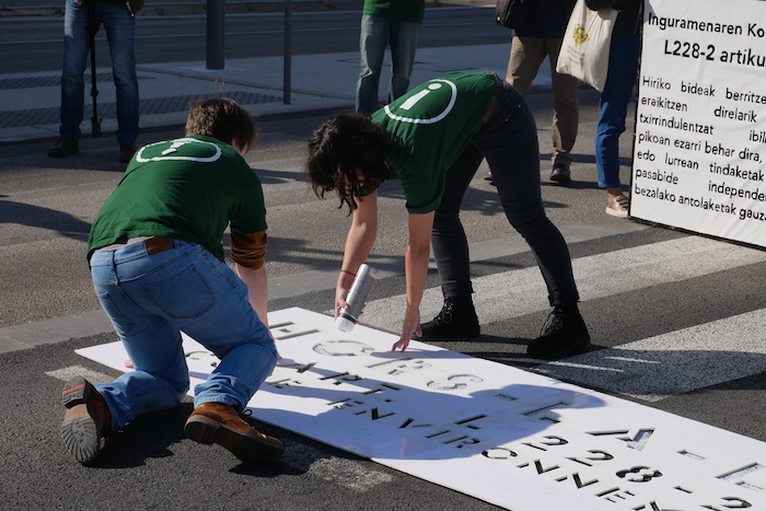 Quelques centaines de mètres seulement après s'être élancée, la manifestation s'est arrêtée une première fois pour marquer la première peinture pendant que Txetx Etcheverry, fondateur de Bizi prenait le micro : « le maire d'Anglet, Claude Olive, est le responsable du syndicat des mobilités de la communauté d'agglomération et il ne respecte pas le plan vélo qui avait été voté en 2014 par tous les représentants de l'agglomération, y compris lui-même ! » Devant la mairie d'Anglet, les manifestants ont enterré le plan vélo sous une montagne de vieilles bicyclettes. Pour eux, ce n'est pas seulement la mairie d'Anglet mais bien toute la côte basque et notamment le BAB (Bayonne, Anglet, Biarritz) qui ne respecte pas la législation et encourage le tout-voiture, au détriment du climat.
