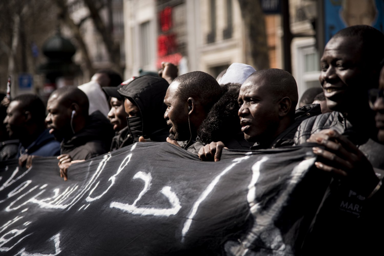 La « marche des solidarités » s'est élancée avant 14 heures, après une minute de silence dédiée aux victimes des crimes racistes, notamment le récent attentat en Nouvelle-Zélande. Le cortège était composé d'habitants des quartiers populaires, de familles de victimes des violences policières, d'exilés et de Gilets jaunes. « Gilets noirs, Gilets noirs », se sont rebaptisés les sans-papiers en lutte.