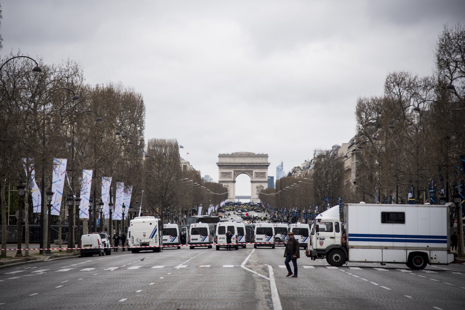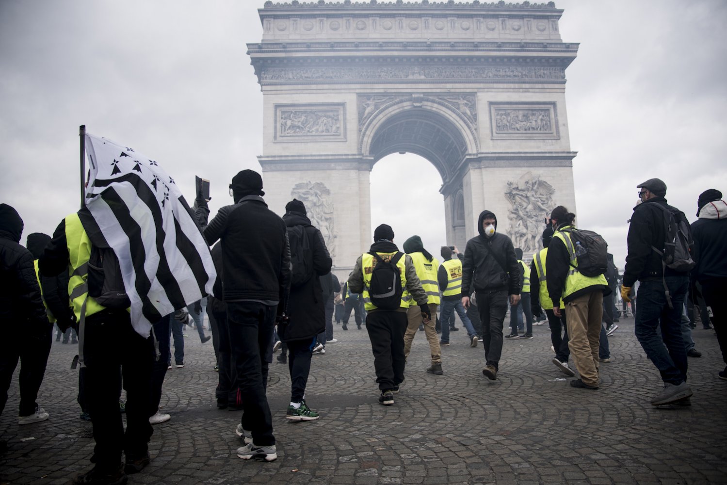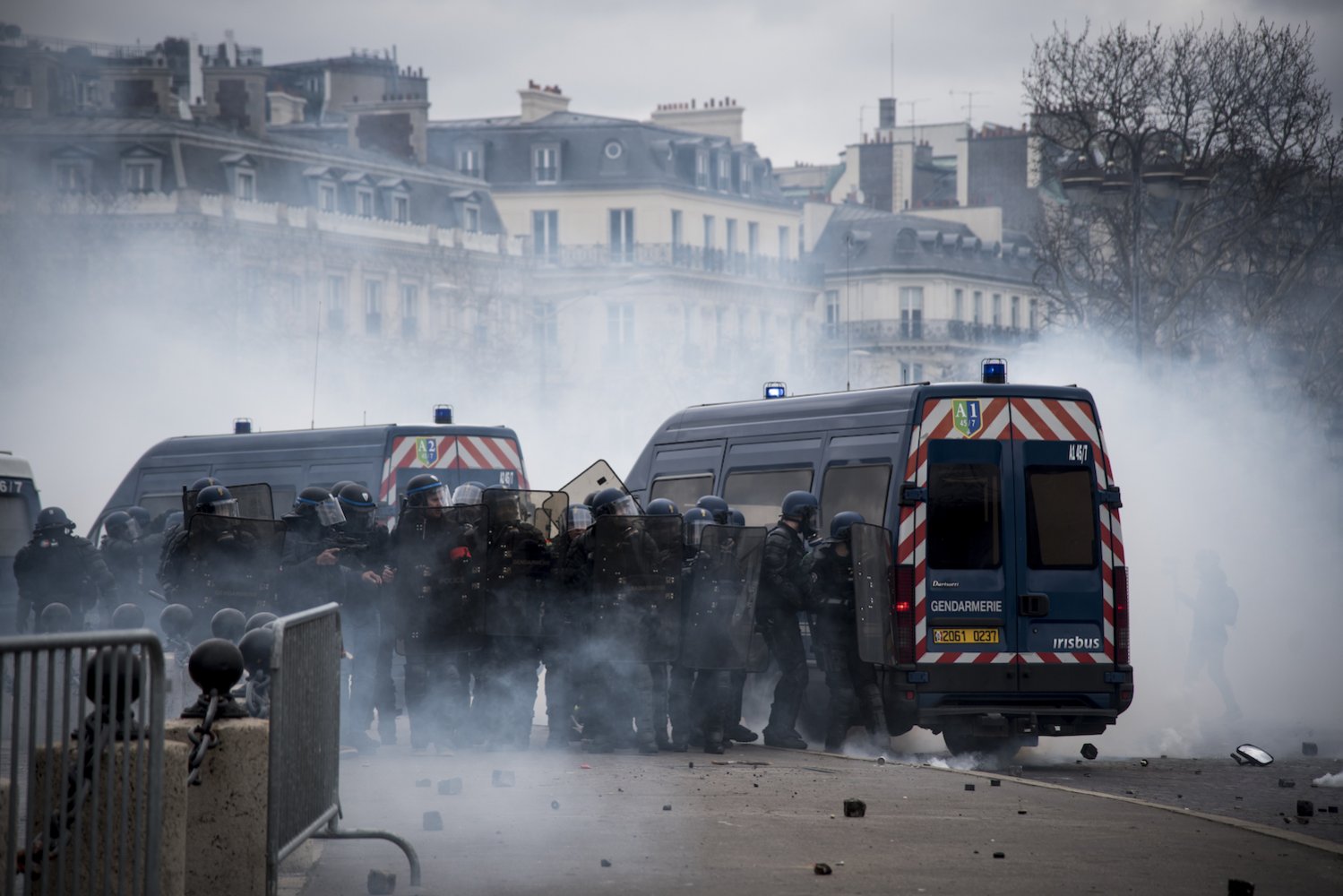 Les forces de l'ordre ont été contraintes de se replier place de l'Étoile, derrière leurs camions, essuyant des jets de pavés et de cocktails Molotov. Ils ont répliqué en noyant la foule sous un épais nuage de gaz lacrymogène.